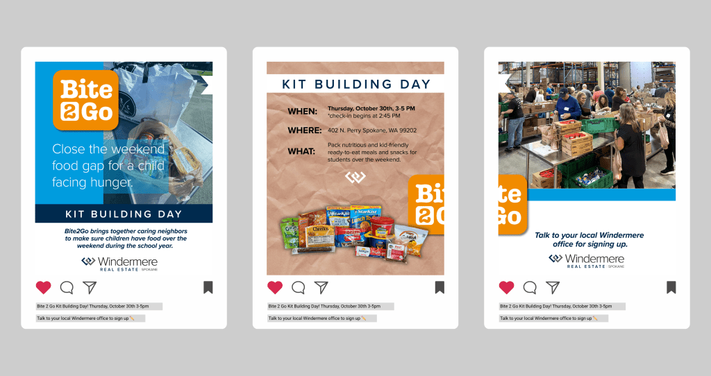 Overview: A social media post developed to promote a local fundraiser. Bite2Go helps students have snack kits over the weekend during the school year, with the goal of closing the food gap for kids facing hunger.
